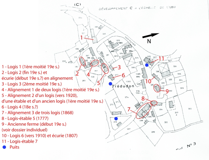 La configuration du hameau n'a que peu évolué depuis 1835. Les cinq îlots bâtis, séparés par des espaces publics en 1835, sont encore lisibles mais bon nombre de constructions, surtout de la seconde moitié du 19e siècle, sont venus combler ces espaces vides. Sur 14 édifices repérés, une ancienne ferme est sélectionnée (voir dossier individuel). La majorité des logis et logis-étable étudiés remontent au 19e siècle à quelques exceptions (logis 4, logis-étable 5 : du 18e siècle ; logis ouest de l'alignement 2 et logis 6 : premier quart 20e siècle). L'écurie attenante au logis 6 a été contruite pour Jean Fer et Marie Le Hir. Voir détail sur le plan masse.