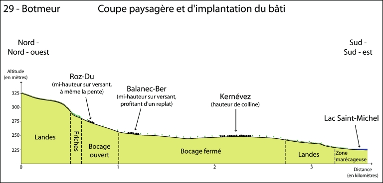 SITUATION ET COMPOSITION D'ENSEMBLE Comme sur les autres communes situées au sud des Monts d'Arrée, la pauvreté du sol explique la présence d'un habitat dispersé, rassemblé en hameaux appelés "villages" dont la densité varie entre une huitaine et une bonne vingtaine de feux. Les fermes isolées sont très rares (Ty Bout, Ty Laurent) et correspondent à un habitat pauvre de lande. La partie montagneuse au nord de Botmeur n'est pas habitée ainsi que la partie sud occupée par le marais (Ar Yeun) et la lande. Les hameaux sont pour la plupart regroupés au centre de la commune, à moins d´un kilomètre les uns des autres, le long d'une ligne formée par la route départementale. Seuls les hameaux de Kernévez et de Botcador sont un peu isolés par rapport aux autres. La comparaison entre le cadastre napoléonien (1836) et le cadastre actuel montre une pérennité dans la stucture des hameaux et ce malgré les modifications successives apportées au cours des générations. Des édicules à usage communautaire, liés aux nécessités de la vie domestique sont construits à l'entrée ou au centre du hameau. C'est le cas des lavoirs (Botcador, Traon, Botmeur, Balanec-Ber, Kerbarguen), des puits communs (Botcador, Roc'h ar Hézec, Creïsquer, Traon) et des fours à pain dont il subsiste peu d'exemples. Chaque hameau adopte sa propre configuration : en alignement le long du chemin (Kernévez), relativement structuré autour d'un espace central (Botcador, Roc'h ar Hézec, Kerbarguen, Balanec-Ber), plus informel, en paquet (Creisquer, Salou). Si la majorité des habitations est orientée au sud ou à l'est afin d´offrir un maximum d´ensoleillement dans un pays humide et venteux, il n'en reste pas moins que l'orientation d'un certain nombre d'entre elles est commandée par la voie ou l´aire commune : à l'ouest et même au nord. Pour cette raison, l´implantation des habitations, au sein des écarts, semble souvent anarchique. MATERIAUX ET MISE EN OEUVRE Les matériaux du gros oeuvre reflètent l´hétérogénéité du sous-sol formé de granite, de schiste et de grès quartzite dit grès armoricain.Toutes les fermes et maisons antérieures au 20e siècle sont construites avec le granite d'extraction locale souvent associé à du grès quartzite et à du schiste, intégré dans la maçonnerie sous forme de moellons et de minces lames. Jusqu'au milieu du 19e siècle, les façades sont en moellons de granite de diverses dimensions, les entourages des baies et les chaînages d'angle sont réalisés en pierre de taille dans le même granite. On trouve également des linteaux de porte et de fenêtre en schiste, notamment sur les étables ou les bâtiments secondaires. Au dessus de quelques linteaux de fenêtres, des larmiers de schiste sont insérés dans la maçonnerie. Les moellons sont irréguliers, sauf sur certaines maisons des 17e et 18e siècles où ils sont régulièrement assisés. A Balanec-Ber, une ferme remarquable datée 1720 conserve une façade en pierre de taille. A partir du milieu du 19e siècle, les moellons de granite utilisés dans la mise en oeuvre sont plus petits et les entourages des baies sont en granite gris clair du Huelgoat. A la fin du 19e siècle et dans le premier quart du 20e siècle, les façades en petits moellons irréguliers sont faites pour être enduites et chaulées afin de mettre en valeur les encadrements des baies et les chaînages d'angle en pierre de taille. Ces enduits sont remplacés plus tard par du ciment. Au bourg, les maisons à caractère urbain étaient enduites dans leur grande majorité. Aujourd´hui, les toitures sont majoritairement en ardoise. Celle-ci a remplacé les couvertures en chaume de paille de seigle généralisées dans les fermes jusqu´au début du 19e siècle. A partir de cette époque et jusque dans les années 1960, les schistes des Monts d'Arrée ont été exploités pour les couvertures des maisons et des fermes. Ceux-ci se débitent en dalles épaisses qui nécéssitent une pause spécifique dite à pureau décroissant (la dimension des ardoises diminue entre la partie inférieure du versant et le faîtage). Le poids de ce materiau réclame une charpente particulièrement solide. La majorité des toitures sont à longs pans et pignons couverts. La pente du toit n´est pas retroussée par des coyaux. Les carrières artisanales déclinent dans les années 1960 et l'ardoise de montagne est remplacée par l'ardoise d'Angers et de Trélazé, moins chère et plus facile à mettre en oeuvre mais qui, à son tour, a été éclipsée par les ardoises provenant d'Espagne. Avec la disparition d'une grande partie des carrières de schiste des Monts d'Arrée se pose le problème du maintien et de la restauration de ces toitures qui font partie intégrante de l'identité du patrimoine local. Le schiste débité en grandes plaques était aussi utilisé pour divers aménagements extérieurs : auvents posés sur des consoles en schsite au-dessus des portes d'entrée, dalle de schiste disposée verticalement au droit de la porte pour servir de coupe-vent (Salou), dalles disposées devant la porte d'un pignon ouest (au bourg). Ces schiste sont également utilisés comme palis pour les murs d'une soue à Balanec-Ber ou la clôture d'une parcelle dans le bourg. Le décor est quasiment inexistant ; la pierre ne se prête pas au décor sculpté comme dans d'autres régions de Bretagne. C'est davantage la diversité et la multiplication des volumes par le jeu des avancées et des ajouts successifs qui contribuent à animer le bâti. STRUCTURES ET TYPOLOGIES On peut établir deux catégories d´habitat : - l'«habitat mixte », caractérisé par la cohabitation des hommes et du bétail sous le même toit ; - l'«habitat à seul usage d'habitation », défini par l'absence de cohabitation entre hommes et animaux. Si la première catégorie domine pour les périodes anciennes (17e, 18e et début 19e siècle), la seconde est mieux représentée