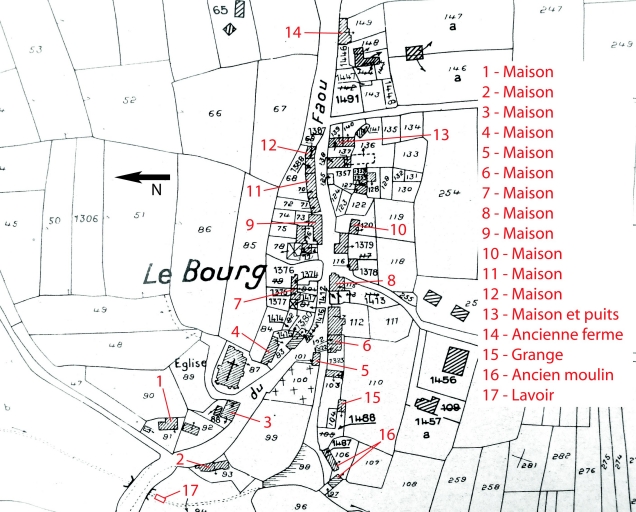 Parties constituantes non étudiéesferme, maison, église paroissiale, croix de chemin, lavoir, moulin, monument aux morts