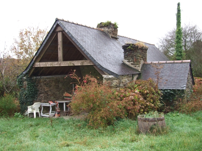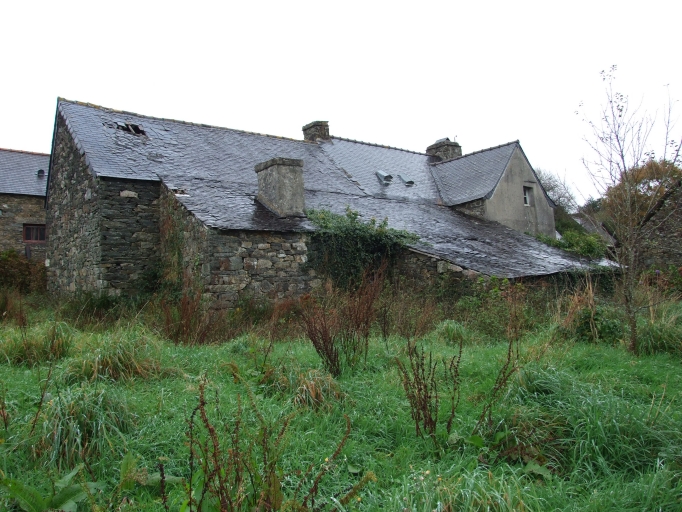 Emploi d'un granite d'extraction locale provenant de l'ancienne carrière du Goël : mise en oeuvre en pierre de taille (logis 1). Recours au schiste pour certains linteaux. Logis 1 (1782) : logis jumelés dont un à avancée, intérieur remanié. Logis 2 (1809) : peut-être ancien logis-étable, associé à un four à pain abrité par un auvent. Logis 3 (1807) : semi-enterré avec escalier postérieur donnant accès à l'extérieur et au grenier ; écurie en alignement avec cheminée destinée à la cuisson des aliments pour le bétail. Logis 4 : à avancée au sud (orientation d'origine), rajout d'une avancée au nord abritant un escalier moderne, sol partiellement couvert de grandes dalles de schiste, saloir surmonté d'une armoire murale encastré dans le mur sud, four à pain dans un appentis s'ouvrant sur la salle. Logis 5 : à étage, type ternaire, enduit.