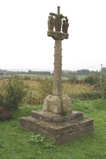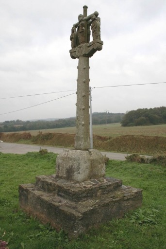 Oeuvre en granite à l'exception des parties sculptées, en kersantite. Statues latérales géminées. Face nord : Christ en croix entouré de sainte Marie Madeleine et de saint Pierre. Sur la traverse nord : deux anges tenant un calice. Face sud : Vierge à l'Enfant entourée de saint Jean et d'une sainte femme. Sur la traverse sud : un ange présente la sainte Face.