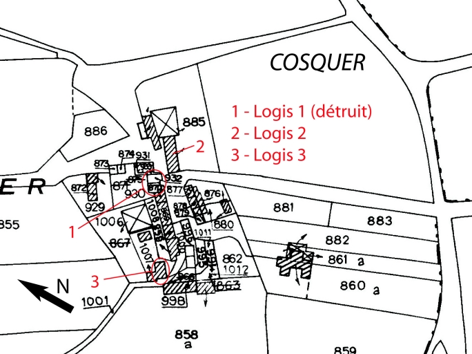 En 1812, l'ensemble était composé d'un alignement de plusieurs logis s'ouvrant sur une cour commune. Le logis 1, daté 1799, en mauvais état en 1974, a disparu dans les années 1980. Le logis 2, reconstruit sur l'emplacement d'un bâtiment plus ancien, porte la date de 1873. Le logis 3 pourrait remonter au milieu du 19e siècle.