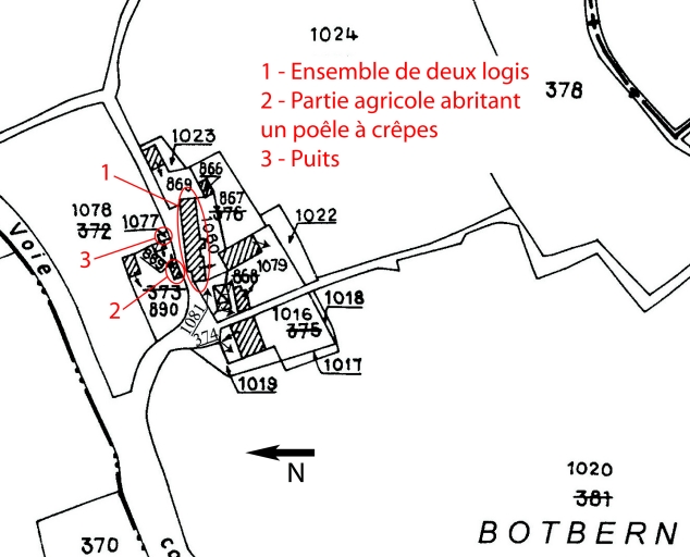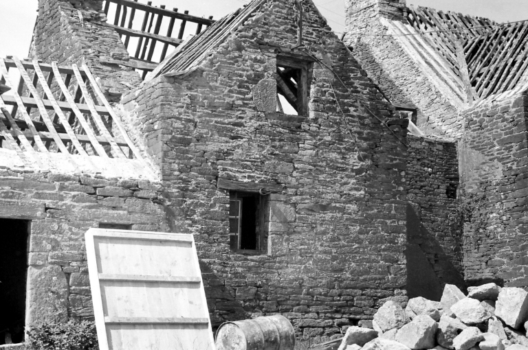 Alignement composé de parties agricoles et de deux logis datés, sur les avancées, respectivement 1696 (logis 1) et 1725 (logis 2). En 1846, on y recense trois ménages et treize habitants. Le puits porte la date de 1831. La dépendance nord (2e moitié 19e siècle), à fonction de fournil, abrite un poêle à crêpes. Propriété du département du Finistère et géré par le Parc Naturel Régional d'Armorique, l'ensemble, restauré à partir de 1974 (réfection des charpentes, des toitures et des huisseries), devait servir d'espace muséal ; il est actuellement non entretenu et inoccupé.