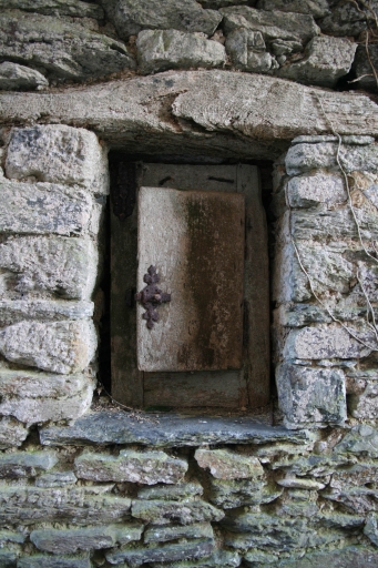 Ensemble donnant sur une cour semi-close. Logis principal : à avancée (étage, toit en bâtière), cloisonnements intérieurs modernes séparant, par un vestibule central, la salle (avancée) d'une pièce à l'origine sans cheminée (conduit et souche rapportés). Logis secondaire : à avancée (rez-de-chaussée, toit rampant) transformé en remise. Cellier attenant avec petite baie conservant une huisserie avec vantail et fermoir anciens.
