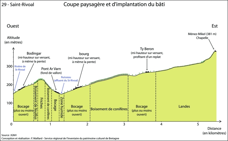 Publiée en 1908, l´étude de Camille Vallaux sur la géographie, la démographie et l´économie rurale de Brasparts et de Saint-Rivoal est fondamentale pour appréhender les paysages, les cultures et l´habitat du secteur entre le milieu du 19e et le début du 20e siècle. Celui-ci observe alors une proportion encore importante de landes : « Ces villages sont entourés de culture, très nettement délimités, qui sont entourés eux-mêmes et dominés de toutes parts par la landes. » Neuf îlots de ce type sont alors présents à Saint-Rivoal (1er au bourg ; 2ème : Lann-ar-Marrou, Bodingar et Penarguer ; 3ème : Linguez, Kernévez et Roquinarc´h ; 4ème : Pen-ar-Goarimic et Ty Béron ; 5ème : Bodenna ; 6ème : Lost ar Hoat ; 7ème : Stumenven et Stangannay ; 8ème : Kergombou ; 9ème : Pen ar Favot et Goaz al Ludu). Outre l´omniprésence de la lande, le seigle était la culture dominante au 18e siècle, remplacée au début du 20e siècle par le froment devenu la base de toute la culture dans le cadre d´un assolement triennal. L´élevage de bovins et de chevaux est important dès le début du 20e siècle, fait corroboré par un nombre élevé d´étables et d´écuries. A cette époque, les défrichements de lande demeurent encore importants (mont Saint-Michel de Brasparts), alors que de nouvelles prairies apparaissent, amendées aux phosphates et au goëmon. En 1908, des plantations de pins, en remplacement de la lande, s'intensifient et leur nombre tend à augmenter.
