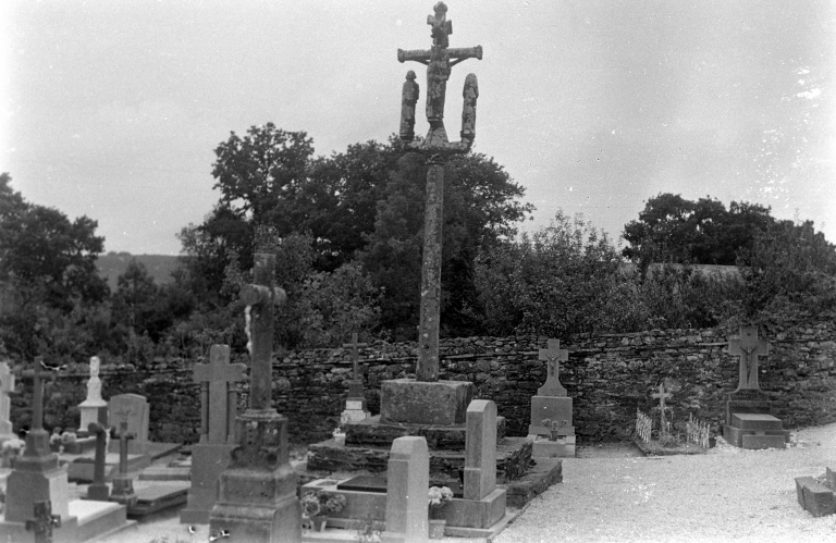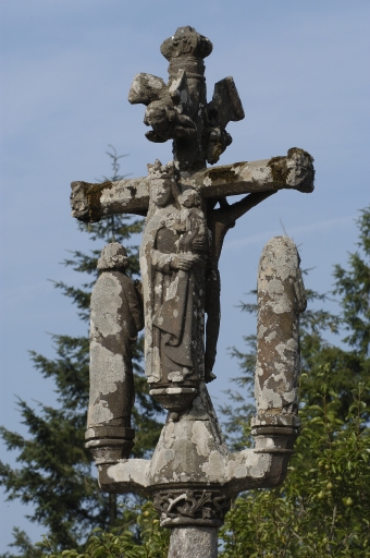 Emmarchement à trois degrés en dalles de schiste. Base carrée et fût chanfreiné en granite. Croix et parties sculptées en kersantite. Face est : Vierge à l'Enfant (Vierge couronnée). Face ouest : groupe de la Crucifixion (Christ en croix, Vierge, Saint Jean, ange).