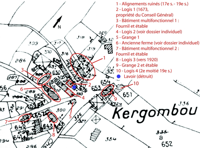La présence du hameau est attestée dès 1630. Composé peut-être d'une dizaine d'anciennes unités agricoles, il n'a que sensiblement évolué depuis 1813. Les anciennes fermes s'organisent de manière linéaire, en cinq ou six alignements parallèles correspondant chacun à une ou deux fermes (partie nord). Le logis 1 (daté 1673, date portée sur l'huisserie ancienne), propriété de l'Ecomusée des Monts d'Arrée, a été démonté en 2005 pour être remonter à proximité de la maison Cornec (au bourg de Saint-Rivoal). Logis 2 et ancienne ferme (sélectionnés) probablement du 18e siècle ; logis 4, granges, étables, et bâtiments multifonctionnels (fournils et étables) de la seconde moitié du 19e siècle ; logis 3 construit vers 1920.