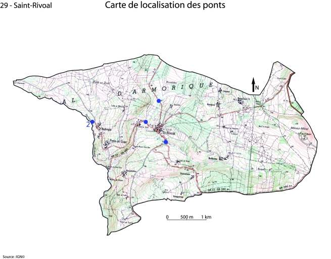 Tous les ponts représentant un intérêt architectural ont été photographiés et localisés, ce qui n'est pas le cas des ouvrages récents en béton et en bois. Les datations exactes ne sont pas facile à établir, mais les cinq ponts repérés pourraient remonter à la seconde moitié du 19e siècle. De source orale, plusieurs passerelles, constituées de dalles monumentales en schiste posées, soit sur des piles maçonnées, soit sur des dalles verticales en schiste, soit sur des blocs en granite, existaient à Saint-Rivoal mais ont été emportées par des crues.