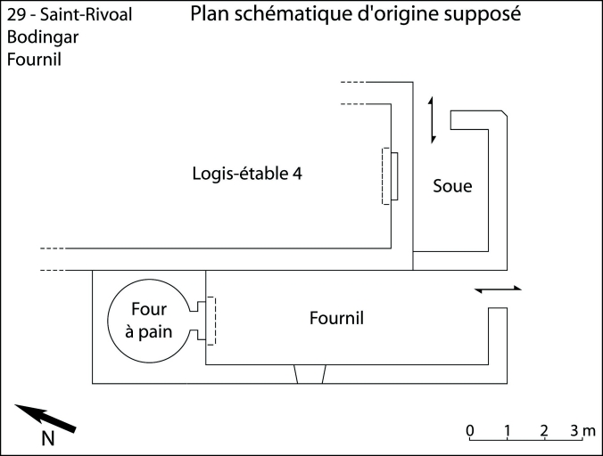 Liés aux nécessités de la vie domestique de chaque hameau, un grand nombre de ces ouvrages a été conservé. Rares sont les écarts qui ne comptent pas au moins un spécimen : Kernévez, Lann-ar-Marrou, Penarguer. Parmi les 17 fours à pain et fournils repérés, dix correspondent à des fournils, sept à des fours. Trois autres (Bodingar, Goarimic et Linguez), non repérés mais photographiés, sont en état de vestiges : voûte détruite, bâtiment sans toiture ou reconversion. On distingue trois types d´édicules : - Four à pain : petit édicule de forme semi-circulaire ou carrée (en général deux à trois mètres de diamètre ou de côté) en moellons de granite, de schiste ou de grès dont la voûte en pierre est accessible par une entrée (gueule du four). Ils sont couverts d´ardoise ou de mottes de terre. Parmi les sept fours à pain repérés, quatre sont situé au bourg (dont trois à la maison Cornec), trois à Pen ar Favot, Roquinarc´h et Stumenven. Un four à pain de la maison Cornec se distingue par ses dimensions (plus de quatre mètre de diamètre) et la date (1870) portée sur l´entrée du four, probablement la date de réfection. - Fournil : petit bâtiment de plan rectangulaire dans lequel on faisait lever la pâte à pain avant de la cuire dans le four généralement placé au pignon. Six fournils ont été recensés : deux au bourg, un à Bodingar, un à Lost ar Hoat, un à Pen ar Favot et un au Moulin d´en Bas. - Bâtiment multifonctionnel : à l'usage de fournil s´ajoute une fonction agricole. Quatre édifices de ce type ont été repérés : un au bourg (fournil et étable), un à Bodenna (fournil et grange ou remise) et deux à Kergombou (fournil et étable).