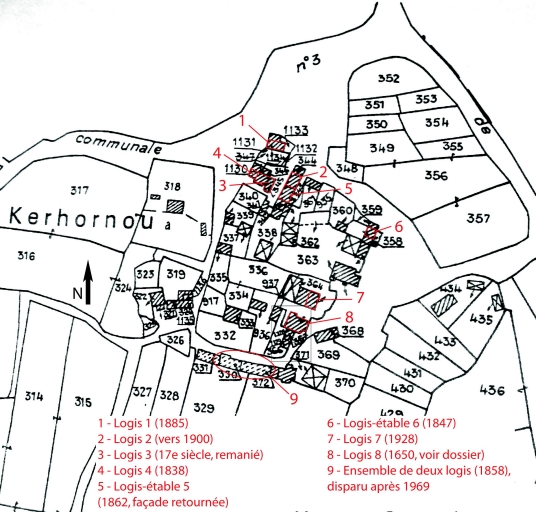 Présence de plusieurs types de logis allant de la maison élémentaire (logis 1, 4, 6) au logis à étage à trois travées (logis 2, 7, ensemble de deux logis disparus). Deux maisons à avancée (logis 3 et 8).