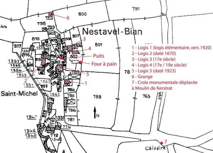 La comparaison entre le cadastre de 1813 et celui de 1994 montre l'implantation d'une demi-douzaine de logis associés aux dépendances. A l'ouest, quelques bâtiments ont disparu lors de la construction du barrage de la centrale hydraulique en 1929. Les bâtiments anciens ont connu des remaniements successifs. Les édifices de la partie sud, non repérés, remontent à la fin du 19e ou au début du 20e siècle. Une croix monumentale du 16e siècle (dite calvaire de Nestavel) a été déplacée au Moulin de Kerstrat (même commune). Cinq ensembles bâtis ont été repérés. Logis 1 : logis élémentaire (vers 1920), décor en façade (trèfle, coeur) Logis 2 : logis à étage daté 1670. Logis 3 : logis du 17e siècle avec escalier de distribution extérieur et avancée (étage, toit rampant), peut-être pas d'origine. Logis 4 : logis à étage (17e et 19e siècle). Logis 5 : logis à étage de type ternaire daté 1923, crépi moucheté. Un ancien logis, dénaturé, conserve un escalier de distribution extérieur.