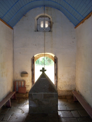 Petit édifice de plan allongé à vaisseau unique. Pignon ouest amorti d´un clocheton à dôme. Chevet arrondi. Gros oeuvre en moellon de schiste et de grès enduit de ciment peint en blanc, à l´exception des encadrements des baies en pierre de taille de granite. Choeur semi-circulaire et lambris de couvrement peint en bleu. Sol couvert de dalles de granite.