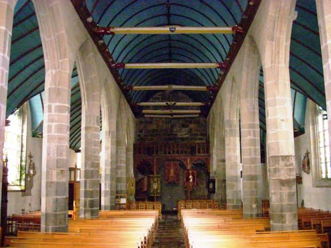 Plan allongé, à trois vaisseaux et à sept travées. Choeur peu profond à chevet plat. Sacristie hors-oeuvre à noues multiples, située au niveau de la septième travée, au sud. Porche sud et nord hors-oeuvre. Chambre des cloches surmontée d'un dôme à lanternon. Gros oeuvre en moellon de granite partiellement enduit de ciment peint couleur crème, à l´exception des encadrements des baies et des chaînages d´angles en pierre de taille de granite. Lambris de couvrement peint en bleu et voussures en marron comme les entraits à engoulants et les sablières. Arcades en arc brisé pénétrant directement dans les piliers octogonaux. Sol couvert de dalles de granite. Tribune à l'ouest.