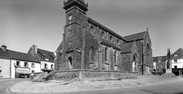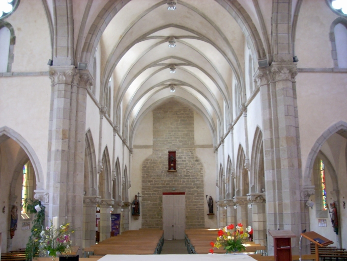 Edifice de plan en croix latine, à trois vaisseaux et à quatre travées. Chevet à pans coupés flanqué de deux sacristies de plan rectangulaire à comble à surcroît. Gros oeuvre en moellon de granite enduit de crépi, à l´exception des encadrements des baies et des chaînages d´angle, en pierre de taille de granite apparente. Clocher avec galerie ajourée, chambre de cloches ajourée surmontée d´une flèche octogonale ornée de crossettes et encadrée à sa base de quatre pinacles et quatre frontons ajourés. Porche sud hors-oeuvre. Voûte à croisées d´ogives éclairée par des fenêtres hautes. Arcades en arc brisé reposant sur les chapiteaux à motifs végétaux des piliers octogonaux. Sol couvert de ciment.