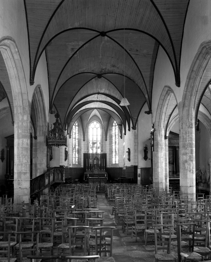 Edifice de plan en croix latine de type nef obscure. Gros oeuvre en moellon recouvert d'un enduit de ciment et pierre de taille de granite apparente aux chaînages d'angle et aux encadrements des baies et des portes. Elévation ouest surmontée par un clocher demi-hors-oeuvre, à chambre de cloches à galerie ajourée en encorbellement surmontée d´une courte flèche cantonnée de crochets. Chevet à pans coupés et à noues multiples flanqué de deux sacristies à façade ordonnancée, à comble à surcroît, l´une au nord, l´autre au sud. Nef à cinq travées, à trois vaisseaux, transept peu débordant, choeur profond. Nef lambrissée imitant voûte sur croisée d´ogives dont les nervures reposent sur des culots feuillagés ou figurés. Arcades en tiers-point à pénétration directe dans les piliers octogonaux. Sol couvert de dalles de granite.