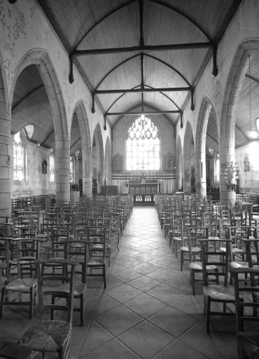 Edifice de plan allongé à trois vaisseaux. Chevet plat. Sacristie hors-oeuvre, de plan rectangulaire, à comble à surcroît, au sud de la nef au niveau de la cinquième travée. Clocher demi-hors-oeuvre, à galerie classique encadrant la chambre des cloches ajourée, surmontée d´un dôme à lanternons. Gros oeuvre en pierre de taille, moellon et moellon équarri de grès, de schiste et de granite partiellement enduit, à l'exception des encadrements des baies et des chaînages d´angle, en pierre de taille de granite. Nef à six travées couverte d´un lambris peint en bleu avec entraits et poinçons peints en marron. Arcades en arc brisé pénétrant directement dans les colonnes. Sol couvert de ciment.