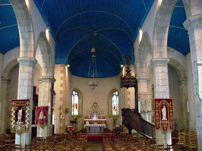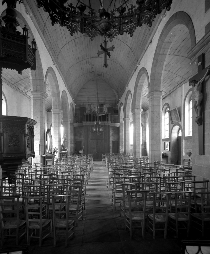 Plan en croix latine à trois vaisseaux ; abside du choeur en cul-de-four couverte d'un toit à croupe ronde ; flanquée de deux petites sacristies en appentis. Clocher hors-oeuvre composé de deux chambres à galeries amorties par un lanternon. Gros oeuvre en moellon de granite enduit de ciment peint en blanc à l'exception des chaînages d'angle et des encadrements de baies en pierre de taille de granite. Nef de type haute à quatre travées, piliers carrés à pans coupés, arcs en plein cintre, lambris de couvrement peint en bleu. Sol en dalle de granite.