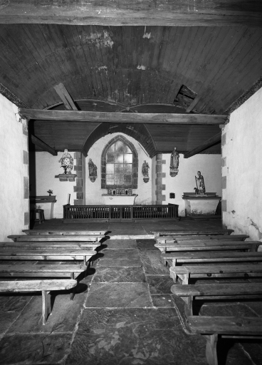 Plan en croix latine à vaisseau unique de type nef obscure avec chevet plat. Clocher-mur avec chambre de cloche carrée amortie d'un dôme à flèche carrée, encadré de quatre crochets. Gros oeuvre à l´extérieur en moellon de schiste et de granite rejointoyé à la chaux et à l'intérieur en moellon et pierre de taille recouvert d´un enduit blanc. Lambris de couvrement peint en bleu et voussures ocre rouge et vert. Entraits et sablières peints en ocre rouge. Sol couvert de dalles d´ardoise. Réemploi d´une pierre tombale pour servir d´autel.