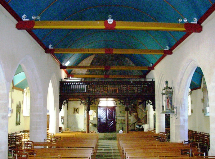 Edifice de plan allongé, sans transept, à trois vaisseaux. Clocher demi-hors-oeuvre, chambre de cloches ajourée amortie d´une flèche octogonale ajourée, encadrée à sa base par quatre frontons ajourés et quatre pinacles. Porche sud hors-oeuvre. Sacristie hors-oeuvre au sud de la quatrième travée, à étage et toit en pavillon. Chevet plat. Gros oeuvre en pierre de taille de granite. Nef de type obscure à quatre travées. Lambris de couvrement peint en bleu, entraits ocre jaune à engoulants rouge. Arcades en arc brisé pénétrant directement dans les colonnes. Sol couvert de dalles de granite.