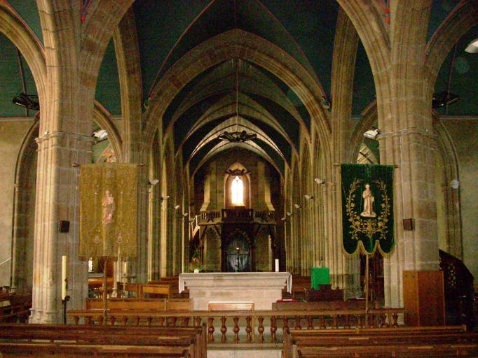 Plan en croix latine. Chevet plat flanqué d´une sacristie de plan polygonal dans l´angle nord-est. Porches sud et nord hors-oeuvre. Clocher à deux chambres de cloches et à trois galeries amortis d´une flèche octogonale encadrée à sa base de quatre pinacles et de quatre frontons ajourés. Gros oeuvre en pierre de taille de granite partiellement enduit de ciment. Nef à trois vaisseaux et cinq travées. Choeur de deux travées flanqué de deux chapelles latérales. Arcades en arc brisé pénétrant directement dans les piliers carrés à colonnettes engagées. Lambris de couvrement peint en bleu et nervures rouges. Sol couvert de dalles de granite.
