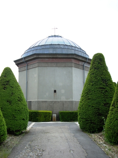 Plan octogonal avec dôme circulaire en zinc. Porche occidental hors-oeuvre à colonnes.