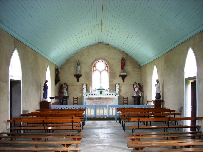 Plan rectangulaire à vaisseau unique. Chevet plat. Pignon ouest coiffé d'un clocheton. Gros oeuvre en moellon de granite enduit de ciment, à l´exception des encadrements des baies et des chaînages d´angle, en pierre de taille de granite. Lambris de couvrement peint en bleu. Sol couvert de ciment.