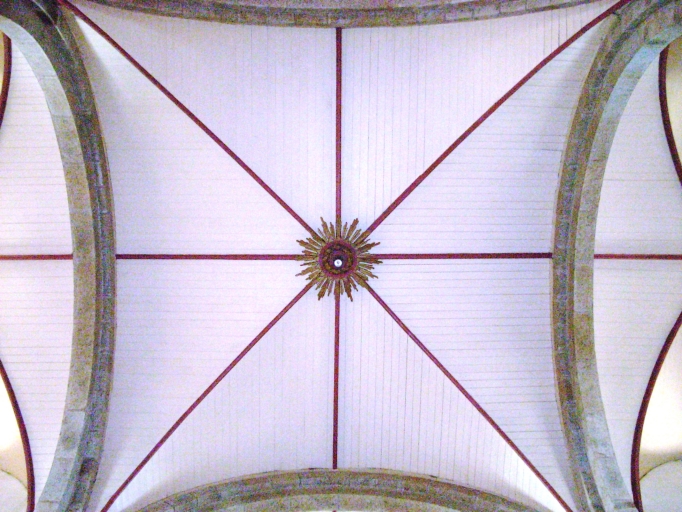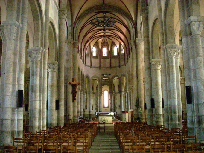 Plan en croix latine à trois vaisseaux. Porche sud hors-oeuvre. Chevet semi-circulaire flanqué d´une sacristie hors-oeuvre de plan octogonal à comble à surcroît et pourvue d'une tourelle d'escalier. Clocher hors-oeuvre à deux galeries et à deux étages de cloches ajourés amortis d´une flèche ajourée octogonale ornée de crossettes et encadrée à sa base par quatre lanternons et quatre frontons ajourés. Gros oeuvre en pierre de taille de granite. Nef à cinq travées éclairée par des fenêtres hautes. Lambris de couvrement peint en blanc et voussures marron sur colonnettes engagées de fond. Arcades plein-cintre reposant sur les chapiteaux composites et des piliers carrés. Choeur à déambulatoire avec trois chapelles rayonnantes. Sol couvert de dalles de granite.