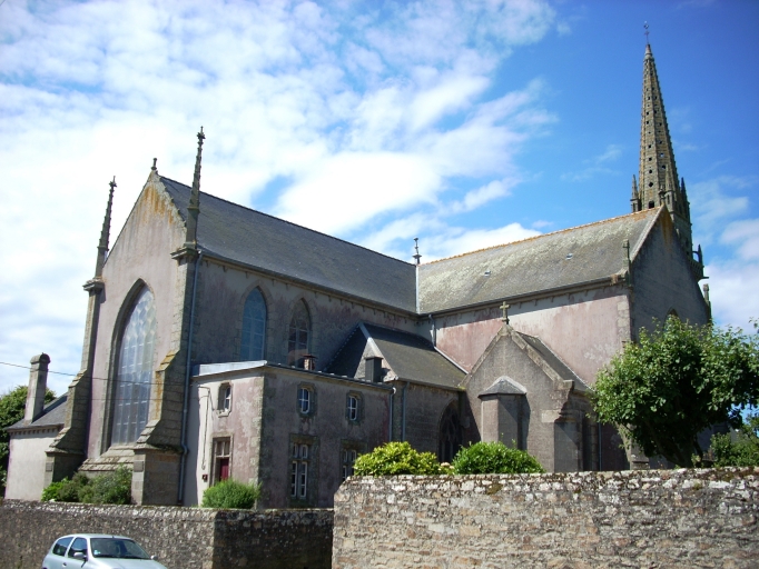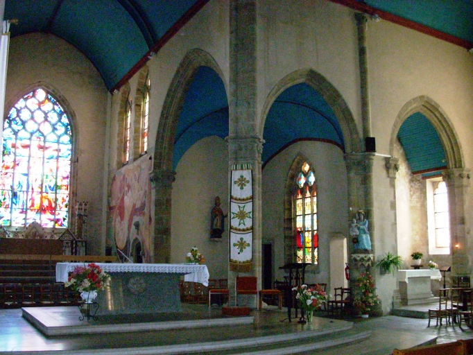 Plan en croix latine à trois vaisseaux. Chevet plat. Clocher à deux galeries et à deux étages de cloches amortis d´une flèche octogonale ajourée ornée de crossettes et encadrée à sa base par quatre frontons. Gros oeuvre en moellon de granite enduit de ciment à l´exception du massif occidental, des encadrements des baies et des chaînages d´angle en pierre de taille de granite. Nef obscure à cinq travées couverte d´un lambris peint en bleu à nervures rouges. Arcades en arc brisé reposant sur des piliers octogonaux à chapiteaux. Choeur flanqué de deux chapelles latérales ouvrant sur le transept. Sol couvert de dalles de granite et de gneiss.