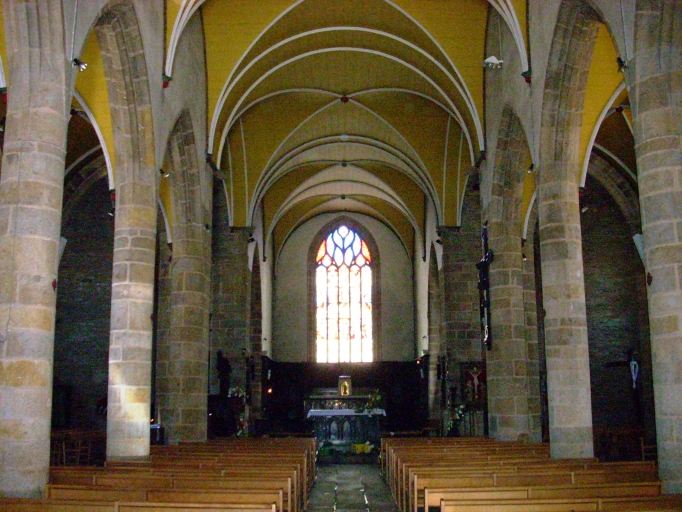 Plan en croix latine à trois vaisseaux. Chevet plat flanqué au nord et au sud de deux sacristies à un étage. Clocher à deux galeries et à deux chambres de cloches amortis d´une flèche octogonale encadrée à sa base par quatre pinacles. Gros oeuvre en pierre de taille de granite et de microdiorite quartzique. Nef à quatre travées couverte d´un lambris peint en jaune à nervures blanches. Arcades en arc brisé pénétrant directement dans les colonnes. Choeur flanqué de deux chapelles latérales ouvertes sur le transept. Sol couvert de dalles de granite et de schiste.
