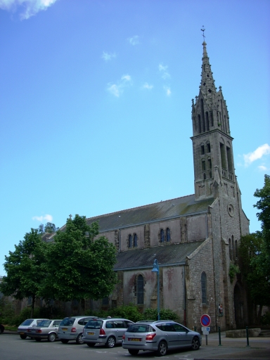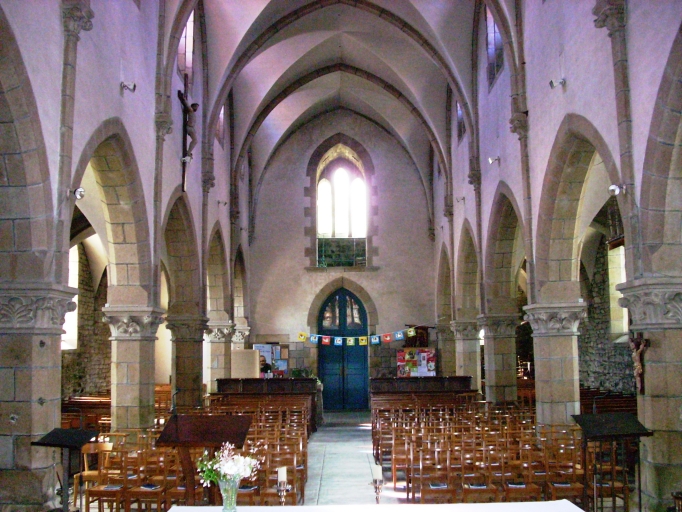 Plan allongé à trois vaisseaux. Chevet plat. Sacristie hors-oeuvre de plan rectangulaire au sud de la cinquième travée. Porche sud hors-oeuvre au niveau de la troisième travée. Clocher dans-oeuvre avec chambre de cloches ajourée amortie d´une flèche ajourée octogonale ornée de choux et encadrée à sa base par quatre gables et quatre pinacles. Gros oeuvre en moellon de granite partiellement enduit de ciment, à l´exception de la façade occidentale, des encadrements des baies et des chaînages d´angle, en pierre de taille de granite. Nef à cinq travées couverte d´une fausse voûte d´arêtes et éclairée par des fenêtres hautes. Arcades en arc brisé reposant sur les chapiteaux des piliers carrés chanfreinés. Massif occidental portant tribune. Sol couvert de ciment.