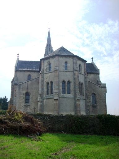 Plan en croix latine à trois vaisseaux. Chevet à pans coupés. Clocher à chambre de cloches amortie d´une flèche octogonale ajourée encadrée à sa base par quatre lanternons et quatre frontons ajourés. Gros oeuvre en moellon et moellon équarri de schiste partiellement enduit de ciment, à l´exception des encadrements des baies et des chaînages d´angle, en pierre de taille de granite. Nef à quatre travées couverte d´une voûte à croisée d´ogives et éclairée par des fenêtres hautes. Arcades en arc brisé reposant sur les chapiteaux des colonnes flanquées de colonnettes engagées. Sol couvert de dalles de granite.