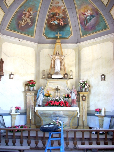 Edifice en mauvais état : le lambris est en mauvais état, l´enduit se décolle sur le mur sud, l´humidité est visible au sol. Edifice de style néo-classique. Edifice associé à un cimetière et à une croix de cimetière.