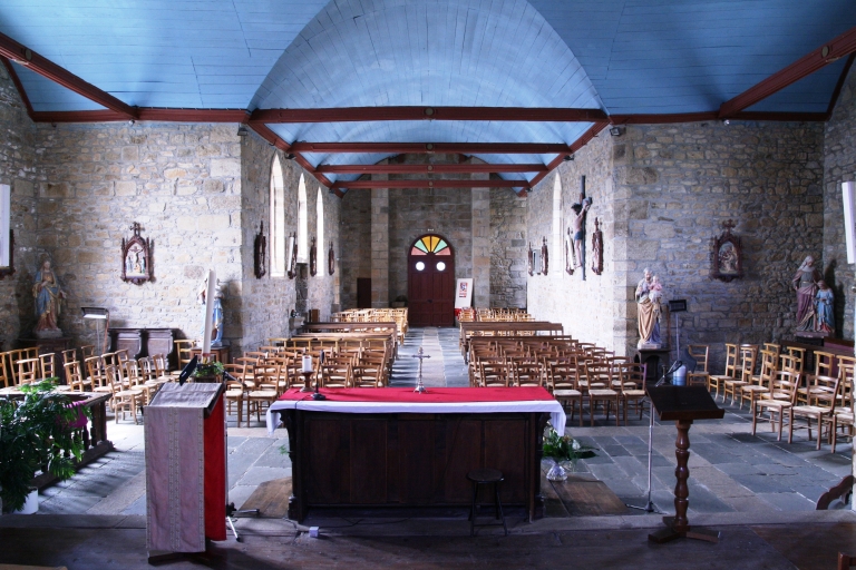 Plan en croix latine à vaisseau unique. Chevet plat flanqué de deux sacristies au nord et au sud, de plans carrés. Clocher flanqué d´une tourelle d´escalier cylindrique abritant un escalier en vis sans jour, à chambre de cloches ajourée ceinte d´une galerie et amortie d´une flèche octogonale ornée de crochet. Gros oeuvre en moellon de granite, à l´exception des encadrements des baies et des chaînages d´angle, en pierre de taille de granite. Lambris de couvrement peint en bleu, entraits peints en rouge. Sol couvert de dalles de schiste et de granite.