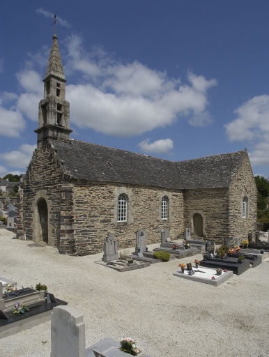 Plan en croix latine à nef unique. Chevet à pans coupés à l'extérieur, mais coffrage en bois à l'intérieur donnant au choeur une forme semi-circulaire. Sacristie nord à toit en appentis. Clocheton à deux niveaux et à deux chambres de cloches. Crossettes représentant un lion (pignon ouest, angle nord) et un homme (pignon ouest, angle sud). Pignon ouest, angle nord : pierre gravée avec début d'incription en lettres gothiques (non déchiffrée). Gros oeuvre en moellon de schiste, de grès et de granite à appareil alterné, à l'exception des baies et probablement de la flèche, en granite provenant en partie de la carrière du Goël en Brasparts.