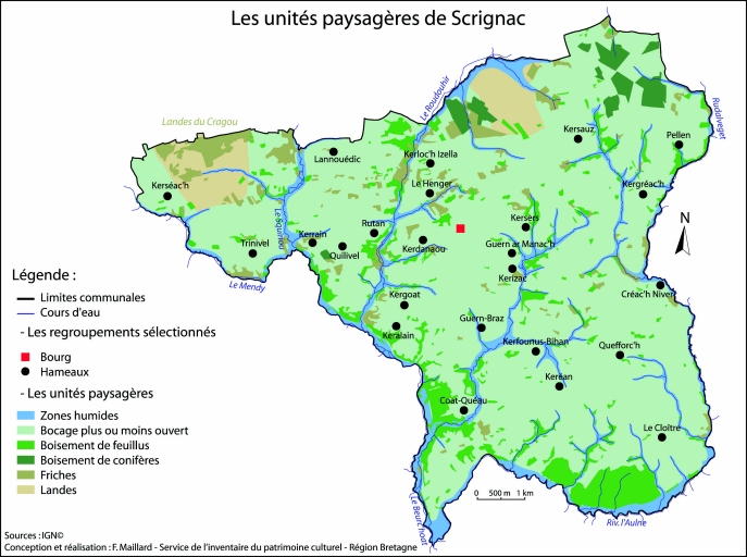 La topographie du territoire de Scrignac apparaît d´une manière schématique sur la carte de Cassini (vers 1770). Les archives confirment l´existence de talus plantés de chênes et de hêtres dès le milieu du 16e siècle. La micro toponymie désigne une culture, modeste toutefois, de lin et de chanvre à l´époque des premiers relevés cadastraux (1836), qui, d´autre part, reflètent encore largement le tracé des chemins, le parcellaire et le bâti hérités d´un passé plus lointain. L´ancien réseau des voies de communication et les structures des hameaux, tels qu´ils existaient alors, sont, pour l´essentiel, toujours en place, même si certains tracés de chemins ont été abandonnés ou modifiés entre le milieu du 19e siècle et l´époque contemporaine.