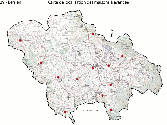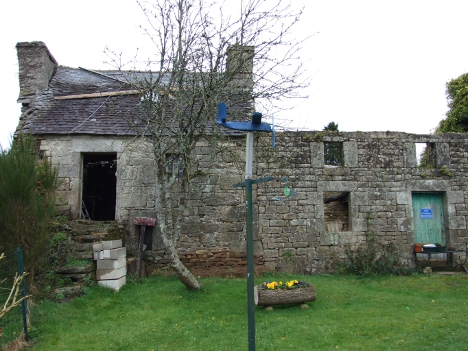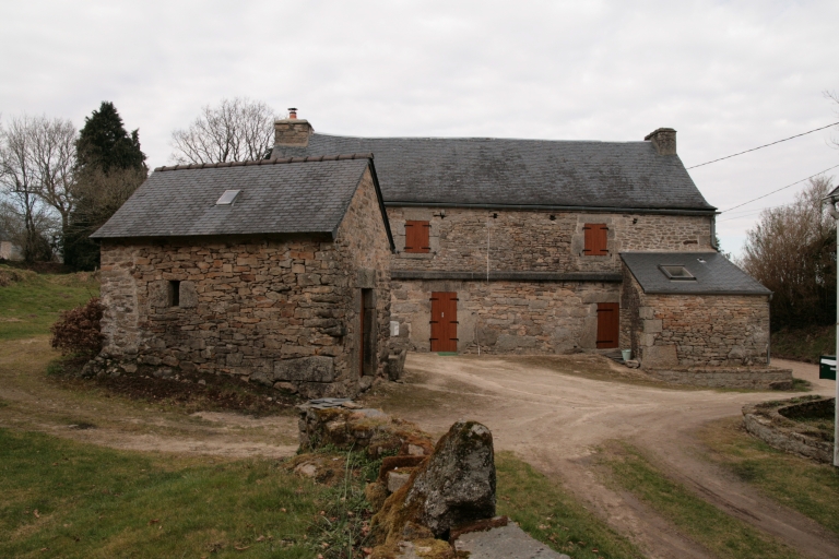 Chronogrammes relevés sur les maisons et les fermes : 1613 ; 1641 ; 1642 ; 1660 ; 1673 ; 1677 ; 1732 ; 1748 ; 1750 ; 1754 ; 1758 ; 1762 ; 1768 ; 1772 ; 1799 ; 1812 ; 1813 ; 1821 ; 1822 (2 fois) ; 1825 ; 1826 ; 1828 ; 1831 ; 1832 ; 1833 ; 1835 ; 1838 ; 1838 ; 1839 (2 fois) ; 1840 (3 fois) ; 1841 (2 fois) ; 1842 (2 fois) ; 1843 (2 fois) ; 1844 (2 fois) ; 1845 (4 fois) ; 1846 (2 fois) ; 1849 (2 fois) ; 1850 (4 fois) ; 1851 (2 fois) ; 1852 (2 fois) ; 1853 (2 fois) ; 1854 ; 1856 (2 fois) ; 1857 (3 fois) ; 1860 (2 fois) ; 1861 (4 fois) ; 1862 (3 fois) ; 1863 (2 fois) ; 1864 (3 fois) ; 1865 (2 fois) ; 1866 (2 fois) ; 1868 (4 fois) ; 1869 ; 1870 ; 1871 (3 fois) ; 1872 (2 fois) ; 1873 (3 fois) ; 1874 (3 fois) ; 1875 (2 fois) ; 1876 (3 fois) ; 1878 (3 fois) ; 1881 (2 fois) ; 1886 (2 fois) ; 1887 (2 fois) ; 1891 ; 1894 ; 1897 ; 1905 ; 1906 ; 1908 ; 1909 (2 fois) ; 1910 (2 fois) ; 1911 (2 fois) ; 1912 ; 1913 ; 1919 ; 1921 ; 1934, soit : 1ère moitié 17e siècle : 3. 2e moitié 17e siècle : 3. 1ère moitié 18e siècle : 2. 2e moitié 18e siècle : 7. 1ère moitié 19e siècle : 35. 2e moitié 19e siècle : 68. 1900-1935 : 14. Observations L'enquête de terrain a été réalisée en 2008, en intégrant quelques éléments recueillis en 1974 lors d'un pré-inventaire succint et partiel. Ce dossier collectif vise deux objectifs : appréhender une "famille" d'édifices représentés en grand nombre et dégager les caractères communs ou spécifiques à cette famille. Reflétant une sélection raisonnée sous forme d'échantillonnage, certains éléments, jugés représentatifs et pas (ou peu) dénaturés, ont été traités en dossiers individuels. Environ 233 édifices sur un total de 944 immeubles (chiffres INSEE 1999), soit environ 24, 6% du bâti, ont été répertoriés. Au sein de ce corpus, 22 oeuvres (édifices individuels ou ensemble de deux édifices) ont fait l'objet d'un dossier individuel. 29 agglomérations (hameaux et bourg) ont également fait l'objet d'un dossier individuel. Les 211 maisons et fermes restantes, simplement repérées, ont été systématiquement illustrées, soit dans un dossier "hameau", soit à la suite de ces observations générales. Au sein de certains hameaux, entités spatiales ou historiques cohérentes et significatives, plusieurs édifices ou ensembles d'édifices ont pu être retenus. La synthèse qui suit concerne uniquement l'habitat rural proprement dit, c'est à dire les maisons et fermes isolées ou situées en écart ainsi que des hameaux entiers lorsque aucun élément ne méritait, à cause des remaniements successifs, un traitement spécifique. CONTEXTE HISTORIQUE Peu de documents permettent de connaître l'espace rural avant la seconde moitié du 18e siècle. La topographie apparaît partiellement sur la carte de Cassini (vers 1770) et surtout sur les premiers relevés cadastraux de 1836 qui reflètent encore largement le parcellaire et le bâti des siècles précédents. Le réseau des voies de communication et les structures des hameaux, tels qu'ils apparaissent en 1836, perdurent au-delà des modifications de certains tracés intervenus depuis la seconde moitié du 19e siècle. Dans ce secteur caractérisé par un relief naturel dominé par les vallons, les collines et de nombreux cours d'eau (Le Mendy, Le Squiriou, Le Fao), l'habitat est dispersé en hameaux de dimensions variables allant de trois à quarante feux suivant leur emplacement géographique : à l'est les hameaux d'essartage en lisière de forêt sont d'implantation plus récentes, entre le 17e siècle et le 19e siècle et n'exèdent pas huit à dix feux tandis qu'à l'ouest où l'occupation des sites remonte au Moyen Age, les hameaux peuvent être très importants et atteindre une quarantaine de foyers. La plupart ont peu évolué depuis la seconde moitié du 19e siècle car les constructions du 20e siècle sont peu nombreuses, particulièrement après les années 1930. La carte de localisation montre une densité d'édifices repérés ou sélectionnés régulièrement répartie ; peu de lieux-dits ne concervent pas un ou plusieurs éléments bâtis recencés. Les densités sont naturellement plus faibles à proximité des zones boisées. Les flancs des Monts d'Arrée, c'est à dire la partie nord-ouest de la commune, sont dépourvus d'habitat. Des résultats observés, et plus particulièrement des chronogrammes relevés sur le bâti, se dégagent plusieurs tendances situant le corpus des constructions rurales dans une chronologie allant de la première moitié du 17e siècle aux années 1930. On constate l'absence de témoins antérieurs au 17e siècle, bien que les travaux historiques et les fouilles archéologiques (ancien hameau du Goënidou) révèlent une occupation généralisée des sites dès le Moyen Age dans une bonne moitié ouest de la commune. Une trentaine de maisons et de fermes, soit à peine 13 % du total pris en compte, remontent aux 17e et 18e siècles, ce nombre relativement peu élevé s'explique par la destruction massive de l'habitat ancien après la Révolution et durant tout le 19e siècle, remplacé, in situ, par un nouveau logis ou transformé dans un but de modernisation. Ce phénomène de renouveau des constructions rurales au cours du 19e siècle et jusqu'au début de la Première Guerre mondiale est corroboré par le nombre élevé de chronogrammes relevés pour cette période. 125 immeubles seraient, suivant les données de l'INSEE, antérieurs à 1915. Une partie du bâti ancien a connu, suite à la déprise agricole des années 1960, un délaissement progressif suivi de réhabilitations ponctuelles. La comparaison entre les résultats des enquêtes de 1974 et de 2008 montre qu'entre la perte d'un patrimoine vernaculaire de qualité et sa réhabilitation, l'interprétation des données doit être nuancée : on assiste aussi bien à des disparitions (Coscastel, Niquelvez), à une érosion forte aboutissant à court terme à des disparitions (Kerma