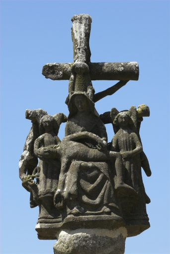 Face ouest : Christ en croix accosté des deux larrons, de la Vierge et de saint Jean. Face est : Vierge de Pitié entourée de deux anges, tandis qu'à la partie supérieure de la croix, un ange descendu du ciel soutient la tête de le Vierge.