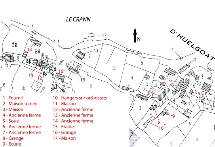 Ce grand hameau est constitué de trois parties distinctes dont la partie du milieu (Crann Kreiz) conserve les éléments les plus ancienns. Chacun de ces noyaux est composé d'un huitaine de feux orientés au sud et à l'est. La partie méridionale est distante d'environ 300 mètres des deux autres agglomérations. L'organisation spatiale de ces trois entités telle qu'elle est représentée sur le cadastre napoléonien est globalement conservée malgré les nombreuses reconstructions de la seconde moitié du 19e siècle, le plus souvent à l'emplacement de maisons plus anciennes. Dans la partie centrale, les habitations et les dépendances ont tendance à être regroupées en alignement plus ou moins parallèles. Au nord les bâtiments sont disposés en fonction des voies de circulation tandis que dans la partie sud ils sont construits de part et d'autre d'un espace central. Au Crann Kreiz, un four à pain commun est situé en bordure de route, à l'écart des maisons tandis qu'au sud du Crann un puits commun est aménagé sur l'espace collectif.