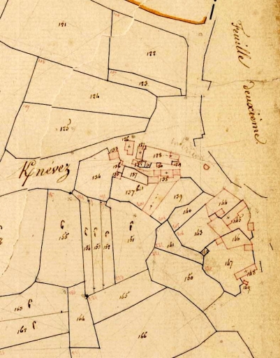 Le hameau comprend plus d'une quarantaine de feux répartis en deux groupes que sépare un espace autrefois commun aux habitants de l'écart. Sa forme en ellipse du nord au sud correspond au type de défrichement pratiqué par les paysans au Moyen Age dans les hameaux de quévaises. Elle est liée à une organisation communautaire caractéristique de cet habitat. Les logis sont orientés au sud ou à l'est. De nombreuses fermes aux dimensions modestes, logis élémentaire associé à une petite étable, ont été construites après le cadastre napoléonien. Une fontaine domestique dite fontaine Goulven se trouvait autrefois aux abords du hameau de Kernévez.
