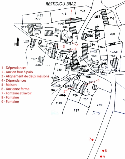 Restidiou Braz est situé au sud de la commune, en lisière de la forêt domaniale de Huelgoat.Trois fontaines domestiques dont une associée à un lavoir sont aménagées aux abords immédiats du hameau, en contrebas, dans la forêt. Cette situation explique l'absence de puits aux abords immédiats des logis. Le four à pain communautaire, aujourd'hui ruiné mais encore visible, marque le centre du village dont les maisons et les fermes sont orientées majoritairement au sud. Au total une douzaine de feux sont organisés autour des voies de circulation inchangées depuis 1836, date du cadastre napoléonien.Trois des fermes constitutives de Restidiou Braz sont en place, parcelles 1165, 777 et 1412. Les dates portées de 1673 et 1758 sur deux maisons ainsi que les vestiges 17e siècle d'une étable témoignent de l'ancienneté de l'agglomération. D'autres maisons ont été reconstruites à l'emplacement de bâtiments plus anciens ou remaniés. De nouvelles dépendances ont été édifiées dans la seconde moitié du 19e siècle. Trois maisons/fermes ont été repérées.