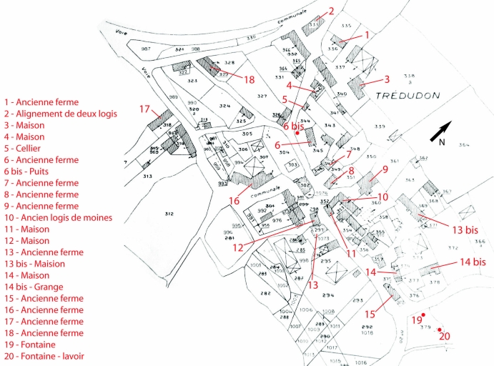 Trédudon-le-Moine est isolé au nord-ouest de la commune, environné de landes. Sous l'Ancien Régime, trois fermes du hameau soumises à l'usement de quévaise dépendaient de l'abbaye cistercienne du Relec située au nord en Plounéour-Ménez. Au centre de l'écart, la maison du 17e siècle dite maison des moines a laissé son nom au hameau, unique témoin de l'occupation cistercienne. Bien que très remaniée aux 19e et 20e siècles, sa taille et sa disposition avec cour pavée, bordée de dépendances la différencie nettement des autres habitations. Ces dernières sont toutes du 19e siècle, à l'exception d'un logis 17e siècle remanié de plan massé à escalier extérieur (parcelle 992) et d'une ferme à avancée datée 1799 (n° 16 parcelle 994). Ce gros hameau regroupait plus de cent habitants entre les deux guerres mondiales. Sur les dix-huit maisons et fermes repérées, deux anciennes fermes ont été sélectionnées.