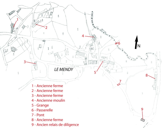 Le hameau du Mendy doit son nom à la rivière qui le longe à l'est et sur lesquels sont établis un ancien moulin à farine et une passerelle sélectionnée pour étude. Situé dans la partie nord de la commune, à la limite de Scrignac et de Berrien, Le Mendy se trouve dans l'aire d'influence de l'abbaye cistercienne du Relec. Cela explique la présence, sous l'Ancien Régime, de sept fermes régies par le système de la quévaise, mode de gestion des terres et des bâtiments mis en place par les moines du Relec. Cependant, à l'exception du logis à avancée du 18e siècle (n°3), aucun bâtiement antérieur au 19e siècle n'est conservé. Une remise datée 1853 (n°9), située à l'est du hameau près de la route Carhaix-Morlaix, aurait servi de relais de poste. Quatre maisons/fermes et un moulin ont été repérés.