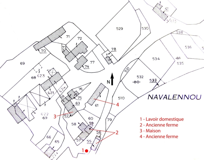 Navalennou compte une demi douzaine de logis orientés au sud et à l'est. La ferme 4 du 17e siècle conservée en l'état parcelle 61 est un des rares bâtiments de cette époque inventorié à Berrien, la majeure partie de l'habitat ayant été reconstruit au cours du 19e siècle. La maison 3 datée 1853 est un bel exemple d'architecture rurale du milieu du 19e siècle. Un lavoir domestique autrefois commun aux habitants est situé au sud du hameau dans un endroit aisément accessible, desservi par deux chemins. Sorte de grande auge en granite pourvue d'un méplat, alimentée par un déversoir. Sur les trois maisons/fermes repérées, une maison est sélectionnée.