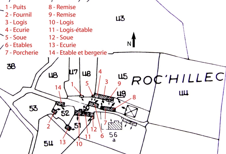 Sur le plan cadastral de 1836, deux fermes constituaient déjà le hameau de Roc'hilliec. Si la structure de cet écart a peu changé depuis le début du 19e siècle, les maisons et les dépendances ont été, pour la plupart, reconstruites dans la seconde moitié du 19e siècle : les dates de reconstruction des logis (1861 et 1868) situés en parcelles 49 et 51 correspondent aux périodes de reconstruction de la plupart des dépendances. A l'ouest, l'étable, établie au bord du chemin qui mène aux habitations, est la seule construction antérieure à 1836 (parcelle 52) avec le logis-étable (parcelle 50), encore la façade nord de ce dernier a t'elle été percée d'ouvertures au début du 20e siècle. L'écurie construite un peu à l'écart porte la date 1912 sur le piédroit de sa cheminée. Sur les deux fermes repérées, une ferme a été sélectionnée.