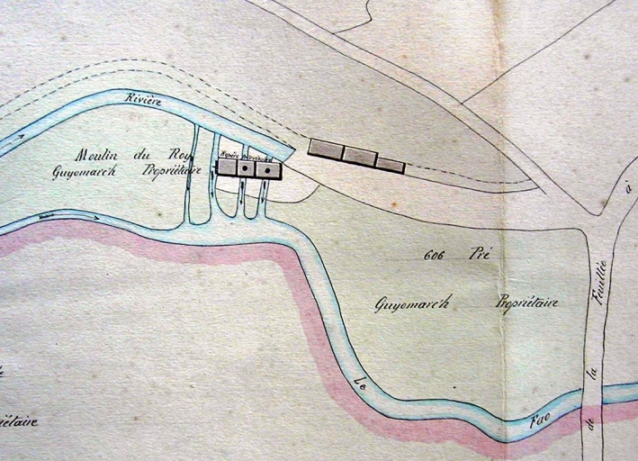 Archives départementales du Finistère, 7 S 29. Moulin du Roy (rivière du Fao). Plan du site dressé par l'ingénieur Tarot, 1880.