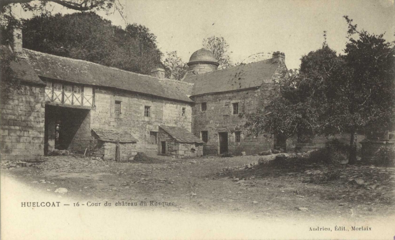 Situé à proximité de la rivière de l´Ellez, le lieu noble du Rusquec est attesté dès 1426. Appartenant à la famille du même nom, il faisait partie d´un grand ensemble comprenant calvaire, allée, enceinte, métairie, logis-porte, cour, puits, communs, jardins, moulins, colombier et vasques (anciennes fontaines). L´ancien logis seigneurial dont ne subsistent que quelques vestiges en élévation remonte au premier quart du 16e siècle, tout comme le puits, l´aile ouest (logis-porte, corps de passage et tourelle) et le colombier. On attribue cette campagne de construction à Anceau du Rusquec, mort en 1522. Les deux tourelles en surplomb (une est ruinée) semblent dater du début du 17e siècle, époque où Alain du Châtel est seigneur des lieux. Jadis alimentées par une fontaine située à l´ouest du manoir, les deux vasques monumentales sont, entre autres, timbrées de ses armoiries ainsi que de celles de Renée de Lannion, épousée en 1637. Le colombier a été restauré en 1722 (date portée). En 1791, le manoir comprenait « une grande maison à deux longères ayant 80 pieds de long (soit 24 mètres) et 26 pieds de large (8 mètres) couvert en ardoise, avec deux pignons et un mur de refend, consistant à trois étages composés de la chambre, une salle, une cuisine, deux caves, un grenier et deux tourelles, ayant une porte, douze fenêtres et quatre lucarnes au midy (sud), une autre porte, huit fenêtres et deux lucarnes au nord, le tout en pierre de taille. » Laissé à l´abandon à partir du milieu du 18e siècle, le manoir a été déclassé en ferme au 19e siècle, époque du réaménagement de la partie ouest de l´ancien logis. Deux bâtiments agricoles, probablement des étables, ont été construits dans la cour, peut-être avec des matériaux provenant de l´ancien logis ruiné dont l´emprise au sol, avec grand pavillon d´angle à l´est, figure encore sur le cadastre de 1813. Le moulin, connu par des documents anciens (voir dossier « moulins ») a disparu en 1923 suite à l´aménagement d´un lac réservoir sur l´Ellez pour alimenter une centrale hydroélectrique. Les bâtiments jouxtant la cour ont été restaurés au cours des années 1990.