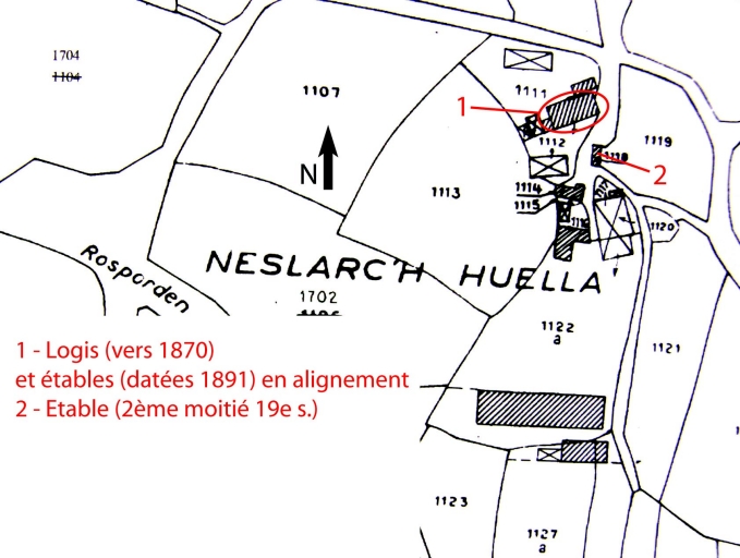 La structure du hameau, composé de deux ou trois fermes, n'a que peu évolué depuis 1813, bien qu'aucun édifice de cette époque ne soit en place. Etable seule de la seconde moitié du 19e siècle, logis probablement construit vers 1870 et étables en alignement datées 1891.