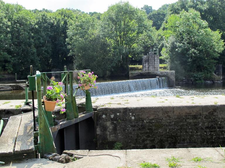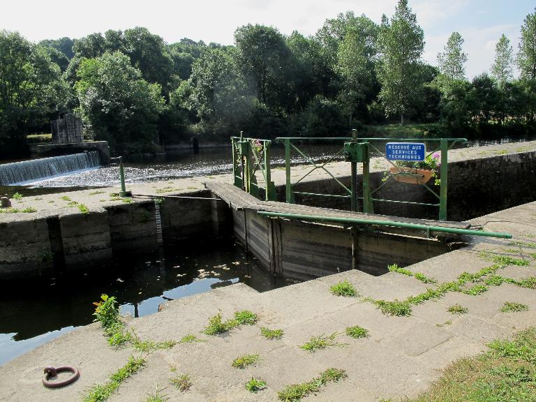 Écluse à sas ; moellons et moyen appareil et moellons de schiste, parements : pierre de taille de granite ; pare-gravier desservi par un escalier : moellons de schiste. État actuel : bajoyers et musoirs grossièrement rejointoyés ; portes métalliques récentes ; pare-gravier partiellement cimenté. Déversoir & vanne au niveau de la porte amont. Déversoir en éperon ; îlot : pierre de taille de granite. État actuel : passe à poissons centrale récente : béton. Vanne contre la rive opposée à l'écluse ; culée : pierre de taille de granite. État actuel : passerelle, vannes et échelle métalliques récentes reposant sur un support en pierre de taille de granite. Trois bornes kilométriques en amont.