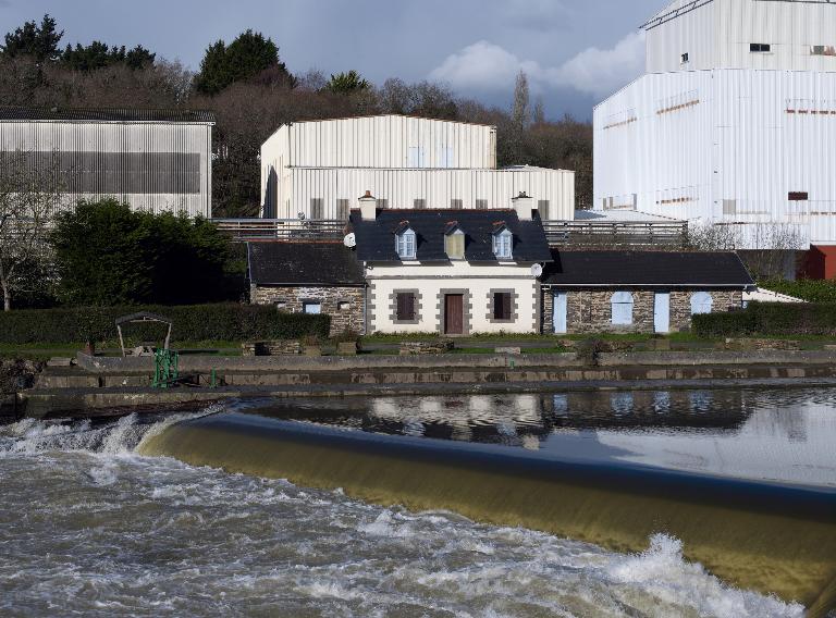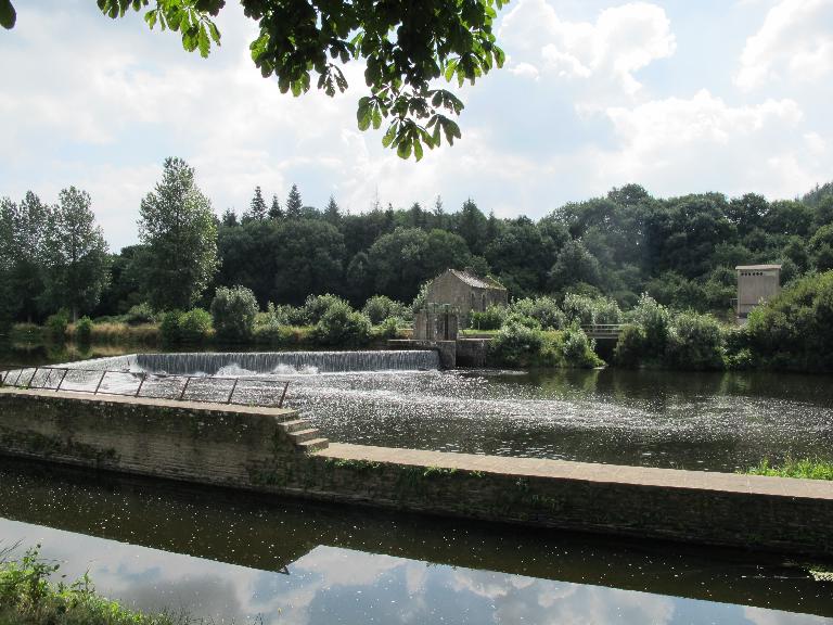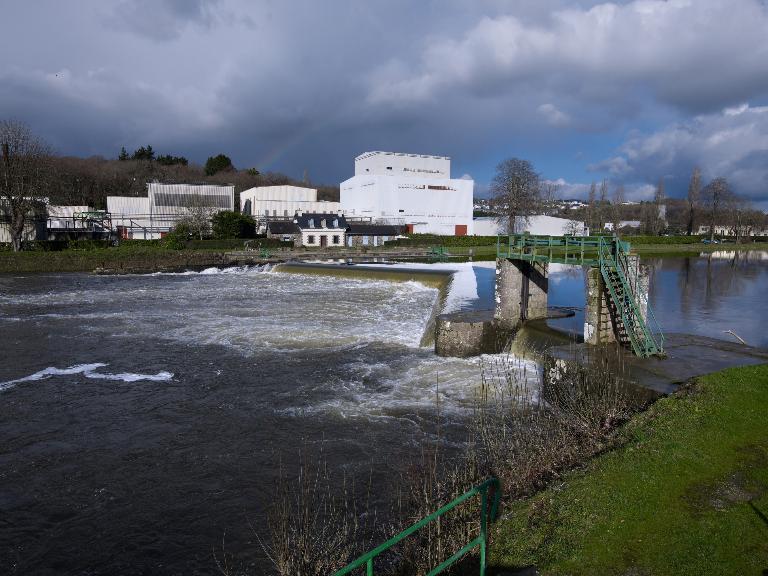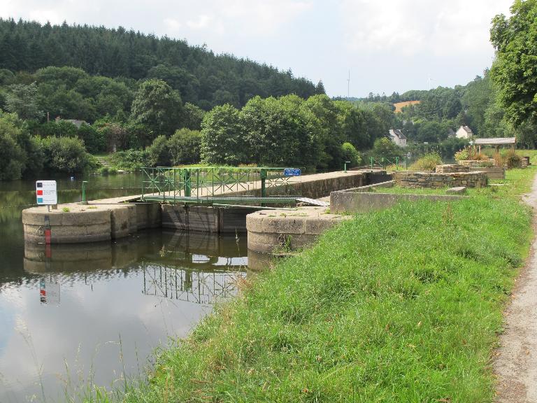 Écluse à sas ; moyen appareil de schiste, parements : pierre de taille de granite ; pare-gravier desservi par un escalier : moellons de schiste, parements supérieurs : appareil de granite. État actuel : sas rejointoyé, fuites importantes ; porte amont métallique rivetée, porte aval disparue. Déversoir & pertuis au niveau de la porte amont. Déversoir en éperon ; îlot : pierre de taille de granite. État actuel : passe à poissons récente couverte d´un grillage : pierre de taille de granite, contre le bajoyer de large. Pertuis contre la rive opposée à l'écluse ; culée : pierre de taille de granite. État actuel : passerelle, vannes et échelle métalliques récentes reposant sur un support en pierre de taille de granite. Ponceau de contre-halage en aval : béton, garde-corps métallique. Deux bornes kilométriques. 150 m en amont de l'écluse, cale, dite "bac de Coatigrac'h" : moellons de schiste, sans parapet. Le granite utilisé dans ce site est le leucogranite du sud-Finistère ou du Morbihan (Chauris).