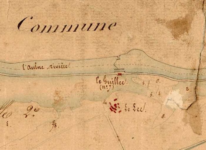 Rive gauche, vestige d'un ancien moulin : en amont du pertuis, 2 murs de soutènement inclinés dans le sens du courant (prise) ; en aval, sortie avec 2 piles à becs arrondis ; pas de bâtiment subsistant.